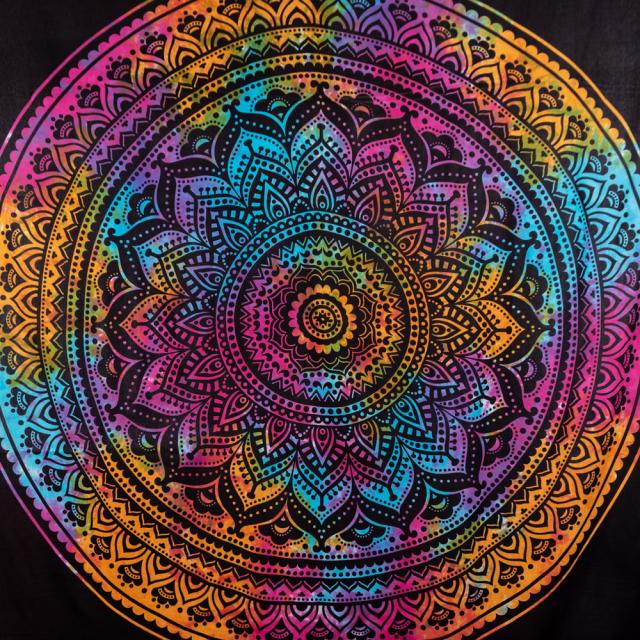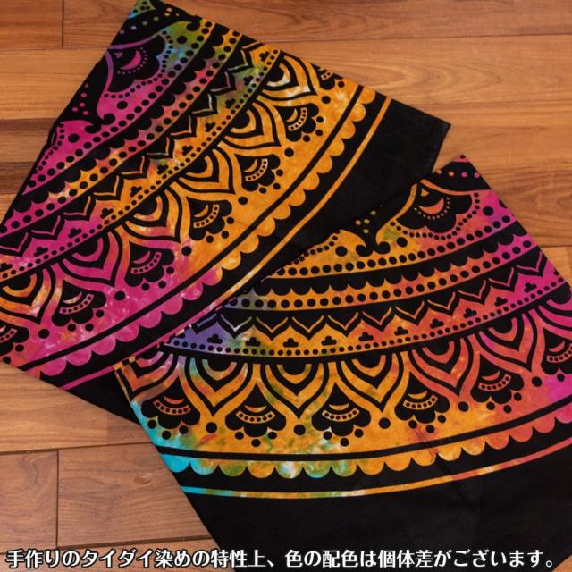 手作りのタイダイ染めの特性上、色の染まり方のは個体差がございます。マルチクロス - マンダラ ホーリーカラータイダイ染め〔約223cm×約205cm〕 / タペストリー、テーブルクロス、マルチクロス、ベッドシーツ、大きなこたつカバー、ベッドカバー、お部屋の装飾、ソファーカバー、マンダラ、曼荼羅、更紗、唐草、インド綿 布、バティック、パーテーション、ボタニカル、更紗 布とファブリック 【インドとアジアンの布