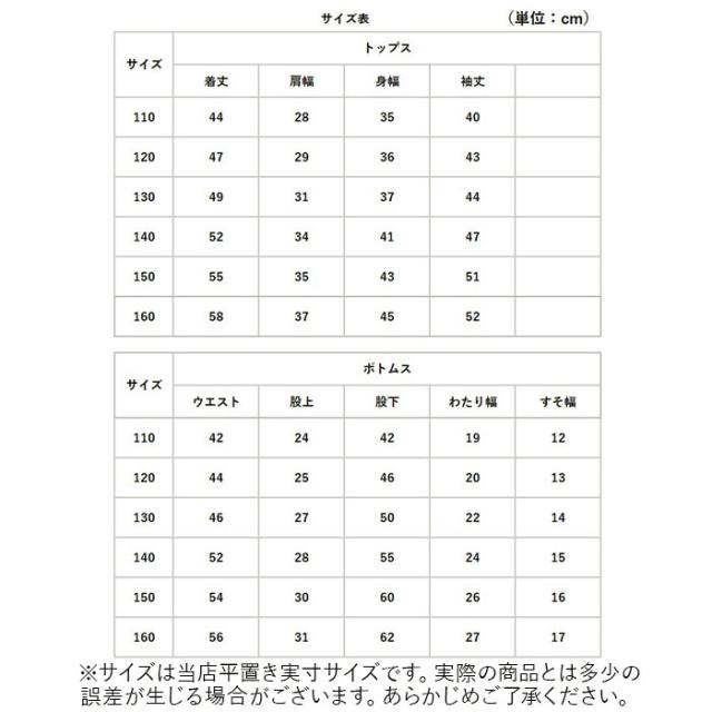 | 重量 | 【トップス】約242g 【ボトムス】約159g (※140センチの商品の重量です。) |