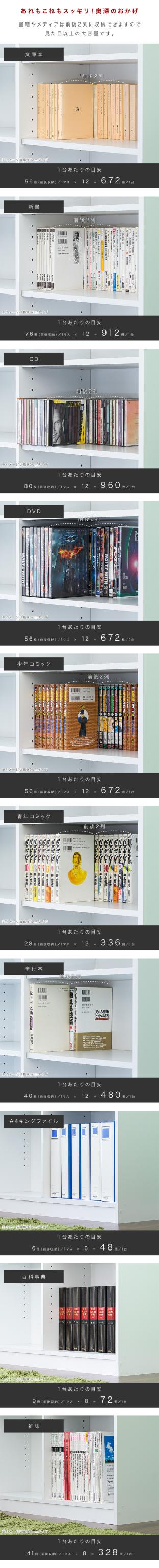 | ■素材:プリント化粧繊維板 ■棚板耐荷重:可動棚5kgまで/固定棚10kgまで ■可動棚は計8枚。 ■棚板は各空間で、3cmピッチ16ヶ所移動できます。 |