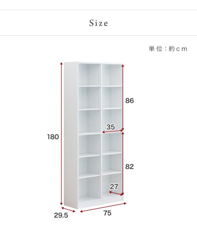 | ■外寸:約幅75cm×奥行き29.5cm×高さ180cm ■内寸: 上段2列:約W35×D27×H86cm。 下段2列:約W35×D27×H82cm。 |