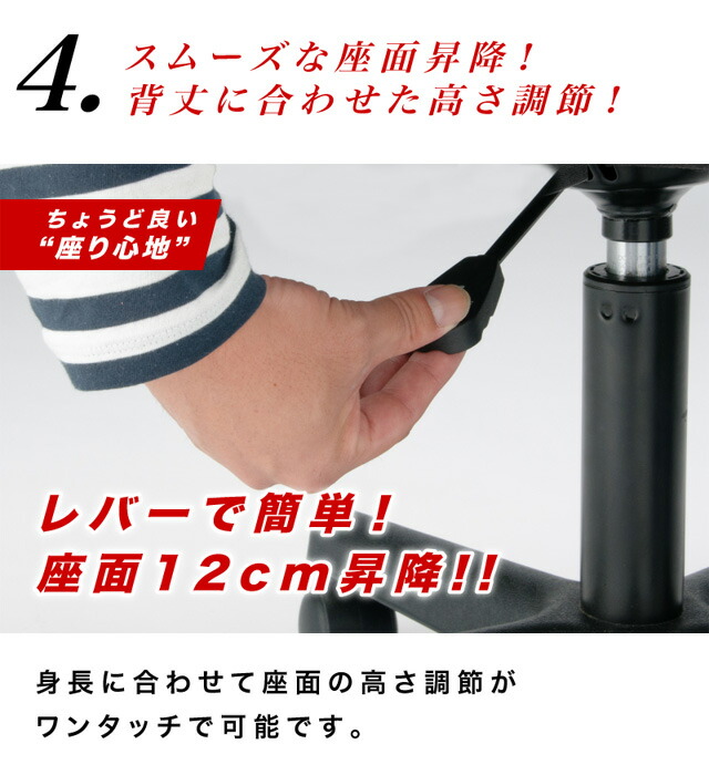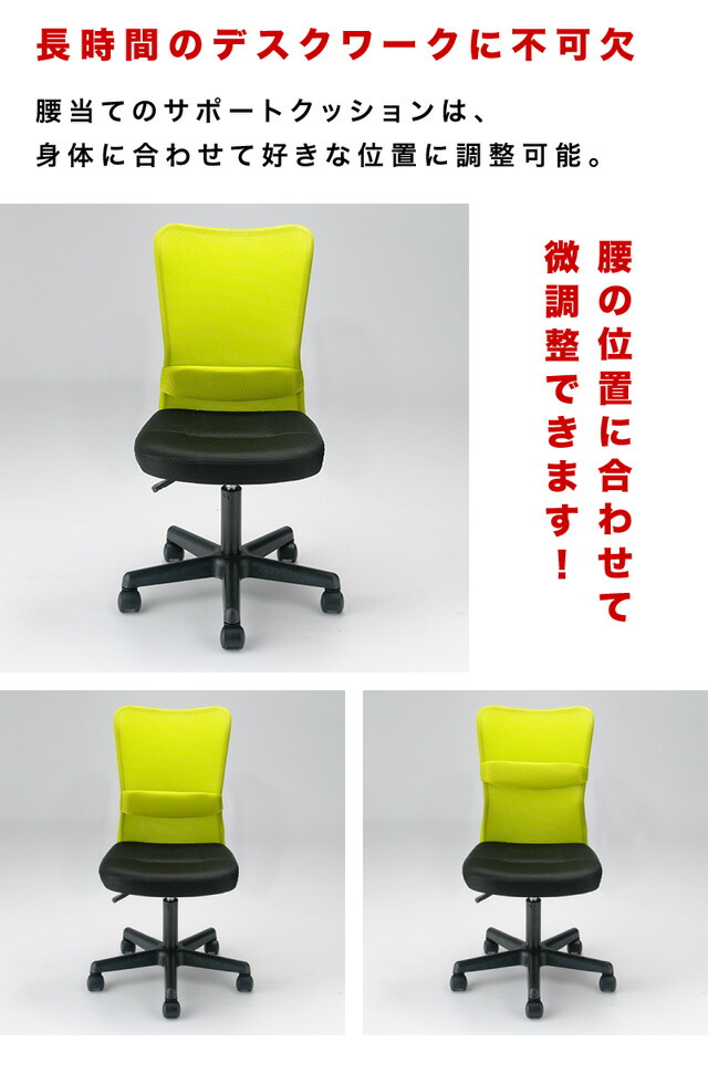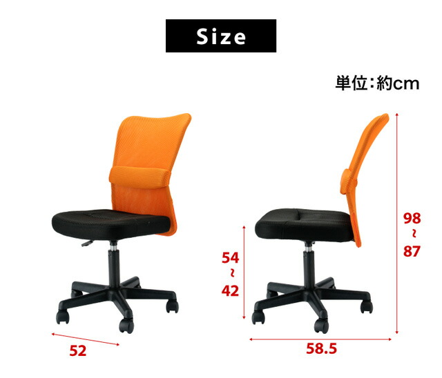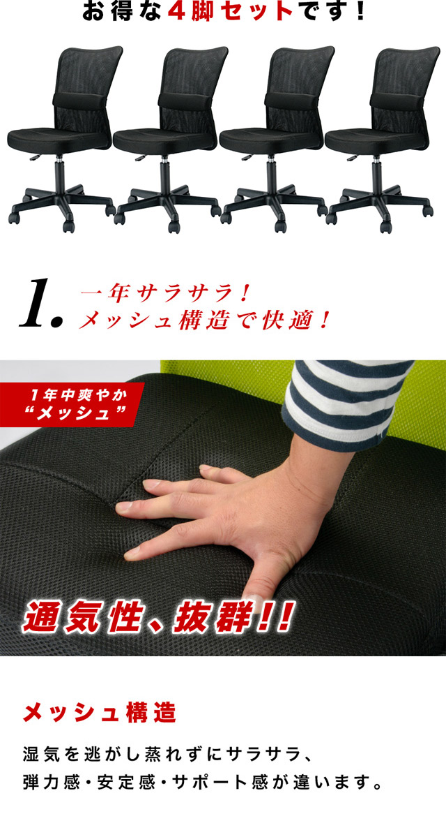 商品説明4脚セット。コストパフォーマンスに優れたチェア。身体も!場所も!そして価格も!場所を選ばないコンパクト設計ですので、自宅でもオフィスでも施設でも大活躍。座には高密度ウレタンを採用。メッシュ素材で包むことで座のボリュームと通気性を確保。背のメッシュ弾力性と腰当てランバーサポートクッションによるダブルケア。程よいクッション性を実現。背もたれのS字構造と、お好きな位置に調整できるランバーサポートによりデスクワークでの身体への負担を軽減します。座面下のワンタッチレバーで誰でも簡単にお好みの高さに調整可能です。(上下12センチ昇降)一般的なオフィスチェアに比べ横幅がコンパクト。邪魔にならない省スペース設計で空間を有効活用できます。摩耗に強いナイロンキャスターを使用しています。劣化に強く、座ったままでも移動ができます。これだけの機能を兼ね備えたチェアはお値段もです。北欧好きやDIY好きにもオススメ!一人暮らし・ファミリー・子供部屋からオフィスまで新生活におすすめの高品質でおしゃれな家具・インテリア・生活雑貨の通販サイト、家具ドキッ!です!!なるべくお求めやすくご提供するために、工場出荷(ファクトリーアウトレットシステム)でのお届けを導入しています。本体サイズ幅52×奥行き58.5×高さ87〜98cmその他サイズ座面サイズ:幅42cm×奥行き43cm座面高さ:42〜54cm商品仕様フレーム:金属(鋼スチール)脚:ナイロン樹脂座面:ウレタンフォーム、チップウレタン、ポリエステル、合板ガスシリンダー式昇降機能ランバークッション付き商品重量6.4kg梱包サイズ幅57×奥行き19×高さ50cm梱包重量7.5kg組み立てお客様ご自身で要組み立て(15分程度)生産国中国椅子コストパフォーマンスを追求!パソコンメッシュチェアーメッシュパソコンチェアーパソコンメッシュバックチェアーメッシュバックパソコンチェアーパソコンオフィスチェアーオフィスパソコンチェアーメッシュオフィスチェアーオフィスメッシュチェアーメッシュバックオフィスチェアーオフィスメッシュバックチェアーパソコンデスクチェアーデスクパソコンチェアーメッシュデスクチェアーデスクメッシュチェアーメッシュバックデスクチェアーデスクメッシュバックチェアーオフィスデスクチェアーデスクオフィスチェアーパソコンパーソナルチェアーパーソナルパソコンチェアーメッシュパーソナルチェアーパーソナルメッシュチェアーメッシュバックパーソナルチェアーパーソナルメッシュバックチェアーパソコンワークチェアーワークパソコンチェアーメッシュワークチェアーワークメッシュチェアーメッシュバックワークチェアーワークメッシュバックチェアーオフィスワークチェアーワークオフィスチェアーデスクワークチェアーワークデスクチェアーデスクパーソナルチェアーパーソナルデスクチェアーイスいす送料無料送料込み カラーバリエーションが豊富ですブラック黒ライムグリーン緑イエロー黄オレンジから選べます。橙だいだいキャスター付きメッシュチェア パソコンチェア 腰がラク コンパクト OL キッズチェア ライト カラフル 塾 来客 受付 疲れにくい 通気性 ランバーサポート 書斎 オフィス ハンター チャット ガルベス 女性 カラフル 移動 コストパフォーマンス お手軽 ガス圧 見た目 可愛い 5000円以下 エコノミー ワンタッチ 腰痛ランバー 腰痛 ガス圧 BIFMA キャスター付き 業務用 オフィス 子供 蒸れない 事務所 会議室 腰あて 勉強机 メッシュバック 学習机用 セット 業務用 まとめ買い 開業更新日20160119オフィスチェア安全規格BIFMA水準をクリア 長時間の利用に安全性と耐久性を備えたコスパ最強チェア ブラック ライムグリーン オレンジ ブルー レッドの選べる5カラー