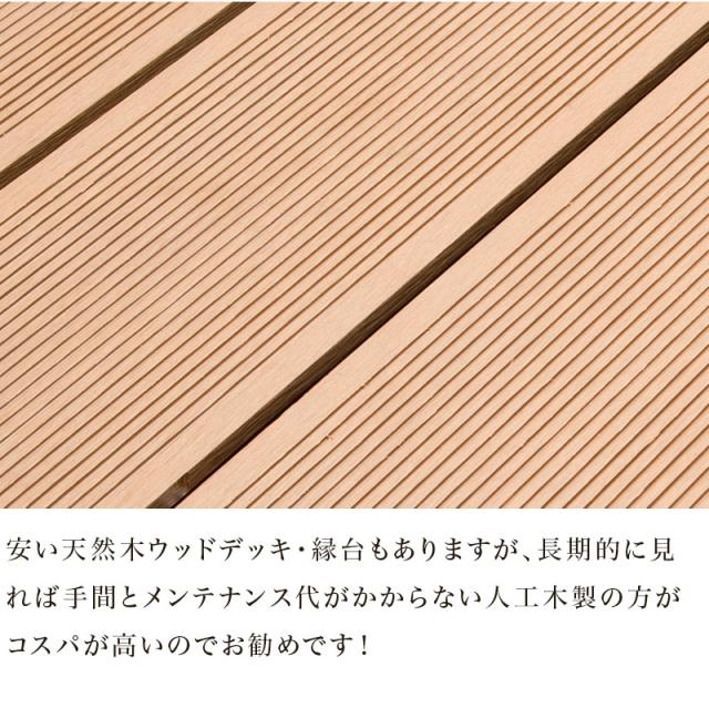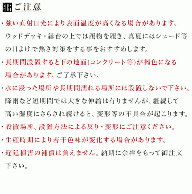 | ご注意下さい:強い直射日光により表面温度が高くなる場合があります。ウッドデッキ・縁台の上では履物を履き、真夏にはシェード等の日よけで熱さ対策をする事をおすすめします。長期間設置すると下の地面(コンクリート等)が褐色になる場合があります。ご了承下さい。水に浸った場所や長期間濡れる場所には設置しないで下さい。降雨など短期間では大きな伸縮は有りませんが、継続して高い湿度にさらされ続けると、変形等の不具合が起こります。設置場所、設置方法による反り・変形にご注意ください。生産時期により若干色味が変化する場合があります。遅延損害の補償は負えません。納期に余裕をもって御注文下さい。 |
