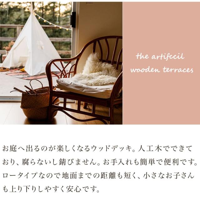 | お庭へ出るのが楽しくなるウッドデッキ。特殊加工で製造した樹脂の人工木で、劣化がとても遅くお手入れも簡単で便利です。ロータイプなので地面までの距離も短く、小さなお子さんも上り下りしやすく安心です。1台に10人乗っても大丈夫な強度。低価格の天然木ウッドデッキ・縁台もありますが、長期的に見れば手間とメンテナンス代がかからない人工木製の方がコスパが高いのでお勧めです。 |