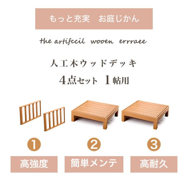 補足説明:ウッドデッキ ウッド風に仕上げた色合いは、人気で高級感のある銘木チークに似せました。ベンチ代わりの休憩のスペースや、ペット同伴可のカフェテラス、簡易ステージなど、業務用としても展開できます。腐食の進行がとても遅く強度も長持ちします 木材のようには腐らない、金属でないから錆びない(組立接続部分には金属ネジを使用しています)、特殊加工で製造した樹脂デッキ シロアリなどの心配も無用、雨に濡れても錆びない、そして1台に大人が10人乗っても大丈夫な強度で長く使えます。重たいところがGOOD強風対策もバッチリ。耐光性も高いので、庭先の縁台に、おしゃれなお庭作りに最適です。お庭に合わせて自由に配置できますので、思い通りのレイアウトが可能。シリーズの柵パネル(ガード・手すり)やステップ台(踏み台)でより安全におしゃれなデッキに。玄関口や窓周り、洗濯物干しスペースなどに段差がある場合は特におすすめのです。のんびりオシャレに、人を呼びたくなる新たな生活スペースをあなたも作ってみませんか。リラックスできるお庭作りにエントランス ガーデン 飲食店にもお勧め カフェテラスで優雅なひと時を過ごす ロータイプ 高齢者や小さなお子さん 小型犬にも ペット 愛犬のペットも嬉しいウッドデッキ エクステリア 室外 アウトドアやDIYが好きな方に ウッドデッキ、縁台、ぬれ縁、人工木材 ロータイプウッドデッキ、人工デッキ、樹脂 ベランダ、えんがわ、ベンチ、庭先、段差 人工木のウッドデッキ、腐りにくい、人工木は錆びない 錆びにくい、色褪せにくい、しっかり、テラス アイウッド、ガーデニング、バーベキュー、人工木、DIY 手すり、ガード、ステップ、踏み台、玄関台、スリッパ ひなたぼっこ、休憩、太陽、物干し竿、エントランス、頑丈 ウッドパネル、リフォーム、バルコニー、エクステリア 本体1台は90cm幅0.25坪、デッキセット、常温常湿、メンテナンスが楽、水洗いOK、組み立て簡単、ウッドテラス