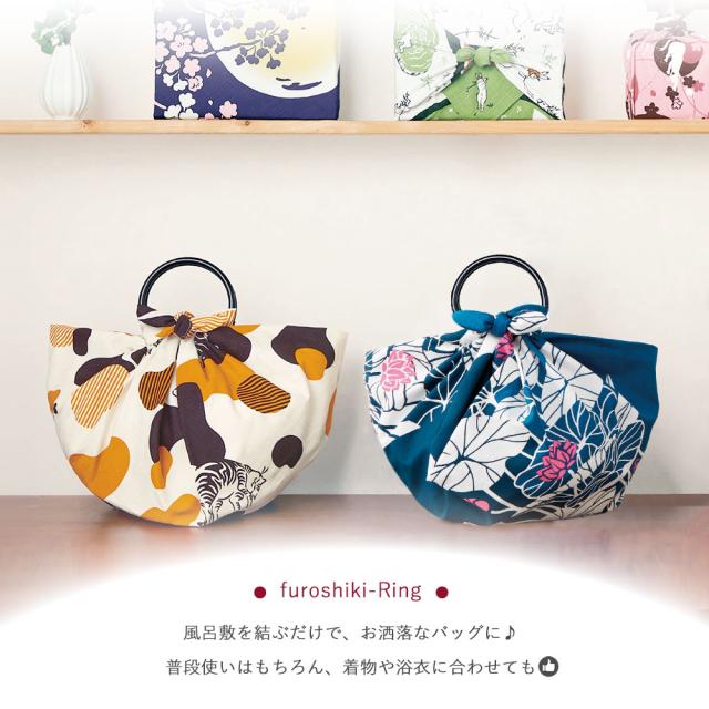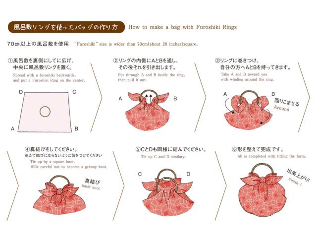 風呂敷を結ぶだけで簡単に持ち手付きのバッグになる、風呂敷リングでございます。