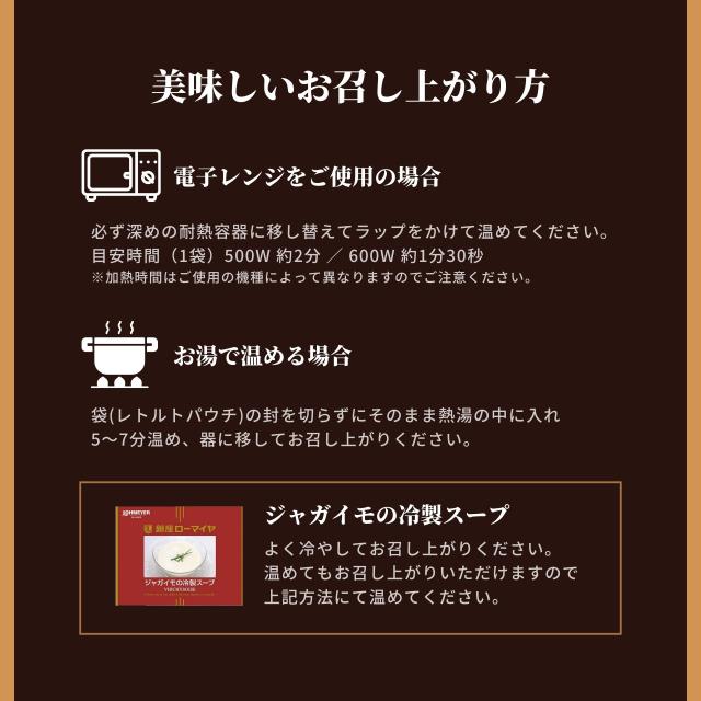 電子レンジ、または湯煎で簡単に本格的なスープがお召し上がりいただけます。