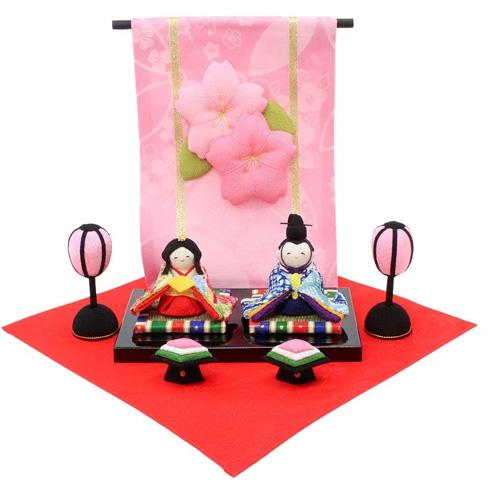 素材のちりめんの風合いをを生かし、細かいところにまでこだわって丁寧に、 大切に、ひとつひとつ手づくりで仕上げたわらべ雛、 ふっくらとしたピンクの花几帳が雛祭りを華やかに演出します