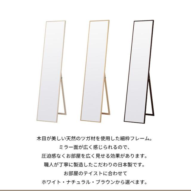 | 職人が丁寧に製造したこだわりの日本製。 細枠スタンドミラー。 木目が美しい天然のツガ材を使用した細枠フレーム。 ミラー面が広く感じられるので、圧迫感なくお部屋を広く見せる効果があります。 ミラーは飛散防止加工が施されているので、万が一強い衝撃が加わったとしても破片が飛び散らないので安心です。 使わない時は折りたたんで家具のすき間などに収納できるので邪魔になりません。 どんなお部屋にも馴染むホワイト、ナチュラル、ブラウンの3カラー。 幅22・32・42・60cmの4種類展開、スタンドミラータイプとウォールミラータイプがございます。 ※こちらのページは幅32cmスタンドミラータイプを販売しております。 |