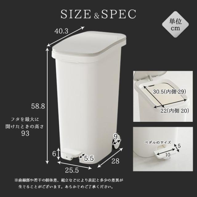■素材:本体・フタ枠・ホイール・袋止め:PP タイヤ:熱可塑性エクストマー 脚ゴム:SBR ペダル板:PS フラップ:ABS樹脂 ダンパーカバー:ポリアセタール ネジ:ステンレス鋼 作動棒:鋼(三価クロメートメッキ) ダンパー:ポリアセタール・ステンレス鋼・シリコーンオイル