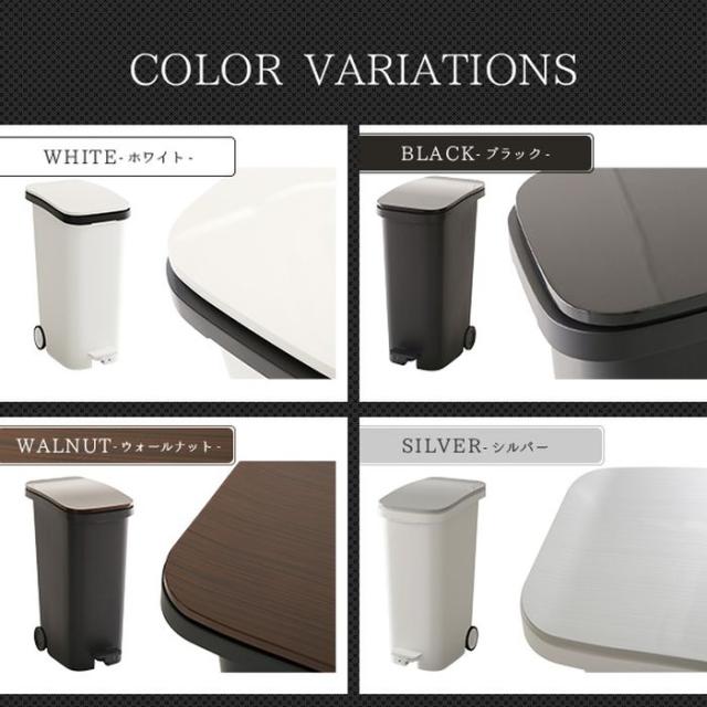 インテリアの邪魔にならないスタイリッシュなデザイン。カラーバリエーションは、ホワイト(JAN:4535306181406/品番:SH-01-PDB--WH)、ブラック(JAN:4535306181413/品番:SH-01-PDB--BK)、ウォールナット(JAN:4535306181437/品番:SH-01-PDB--WAL)、シルバー(JAN:4535306181420/品番:SH-01-PDB--SL)です。キャスター付きなので、ゴミの回収や掃除の際も移動がスムーズに!幅の狭いスリムな形状で、フタはペダル式で両手がふさがっていてもラクラク開閉!ダンパー機能付きでゆっくりフタが閉まるので静音で安心です。