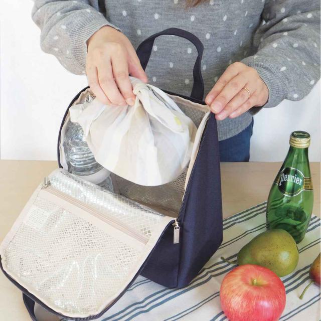 開け閉めしやすいダブルファスナーで開くと、入れ口が大きく開くのでお弁当を傾けることなく出し入れができます。また、内側にもファスナータイプの大きなメッシュポケットが付いているので、小物が収納できて便利です。