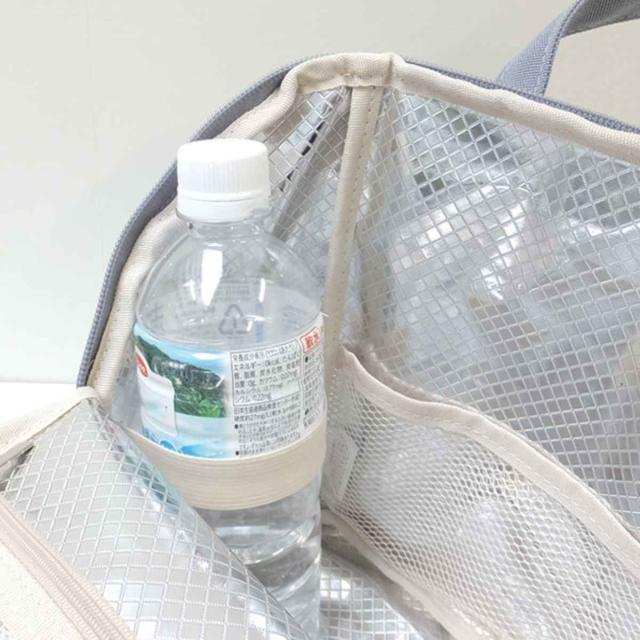 内側にはボトルを立てて収納するときに便利なゴムバンドが付いています。また、外気温度の干渉を防いでくれる厚みのあるフィルムが使用されているので、保冷剤と一緒にお使いいただくと保冷効果も期待できます。また、内側の背面部分には保冷剤入れとして便利なメッシュポケットが付いています。