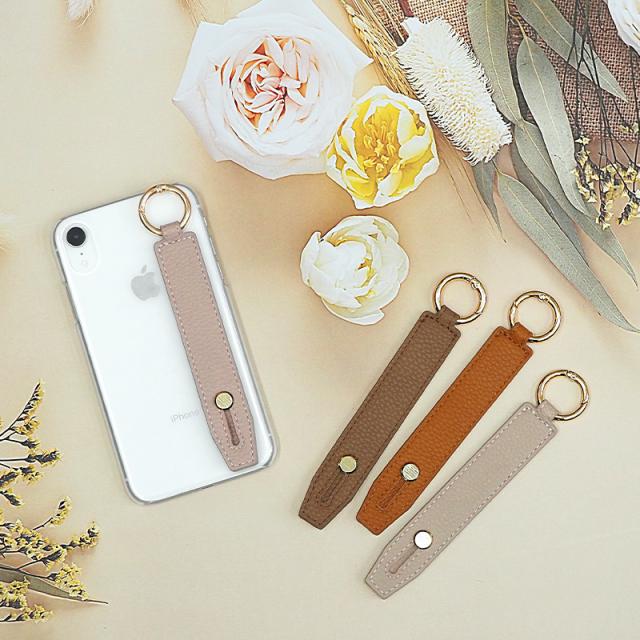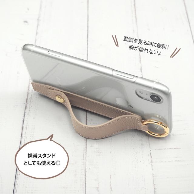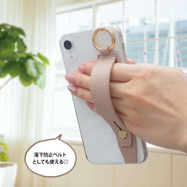 裏面には、落下防止ベルトや携帯スタンドとして使えるレザーのベルトが付いています。