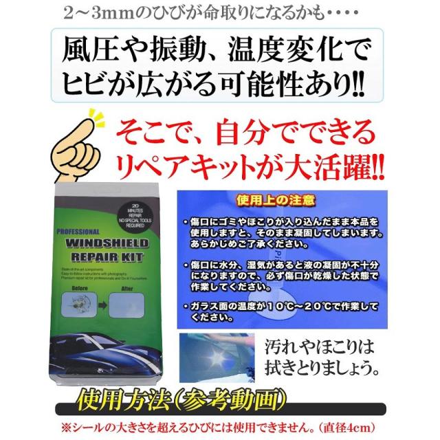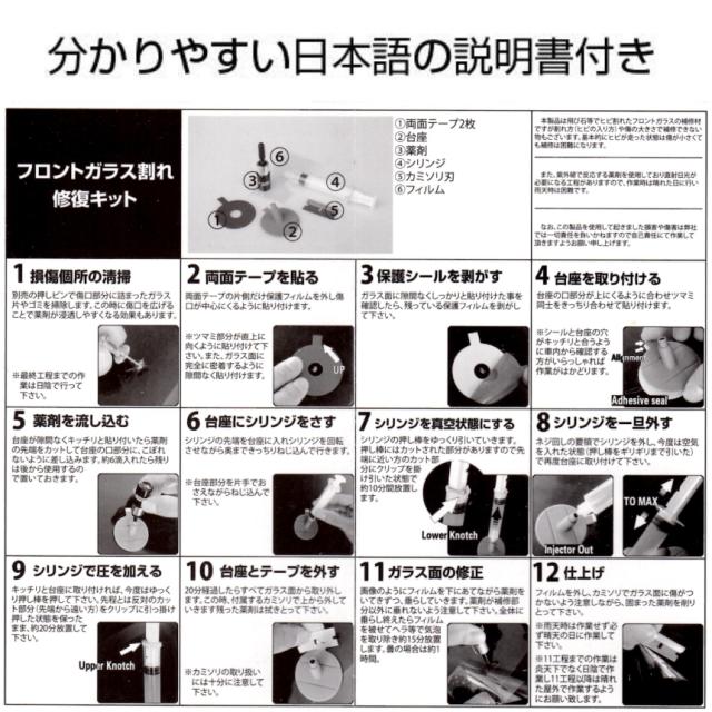飛び石によりひびの入ったフロントガラスを直せるキットです。