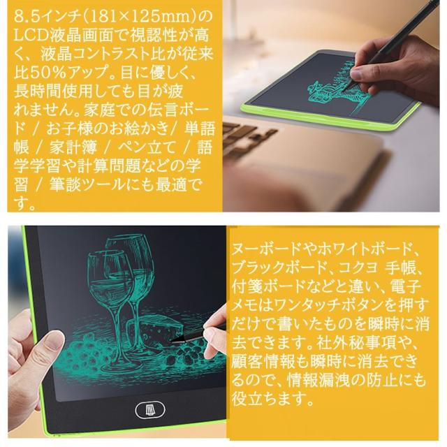 お絵描き 電子 パッド 8.5インチ 書いて消せる ボード カラー 落書き メモ帳 伝言板 ノート 文字 計算 練習 ロック 機能 子供 キッズ ギフト クリスマス DENSIPA 送料無料