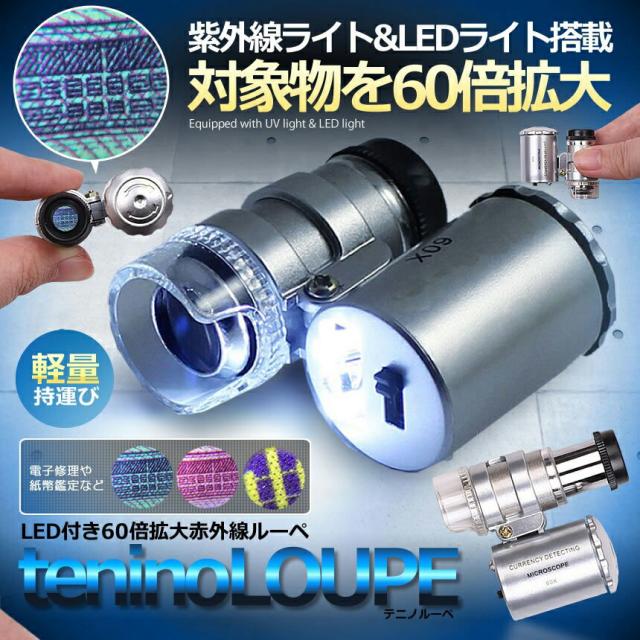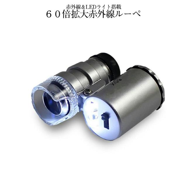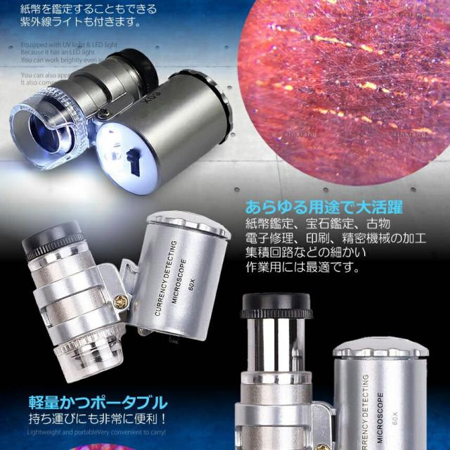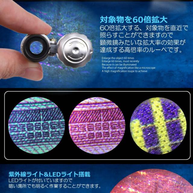 60倍 拡大 小型 ルーペ 紫外線 LED UV ライト マイクロ スコープ ブラックライト 虫眼鏡 作業 顕微鏡 鑑定 研究 校正 校閲 日本語説明書 宝石 軽量 ミニ SRUPE 送料無料