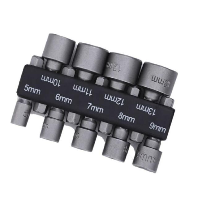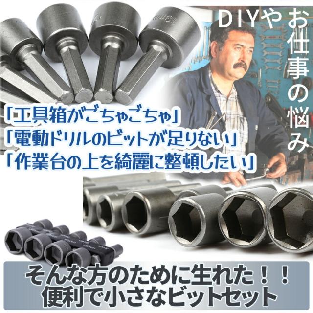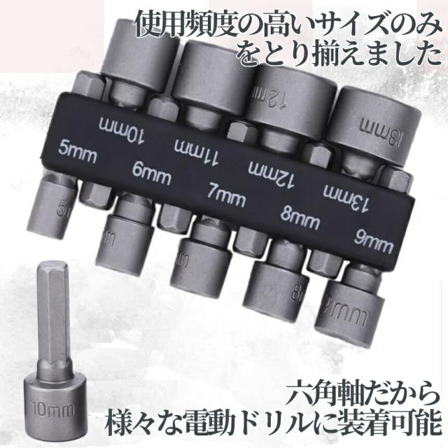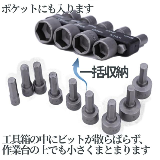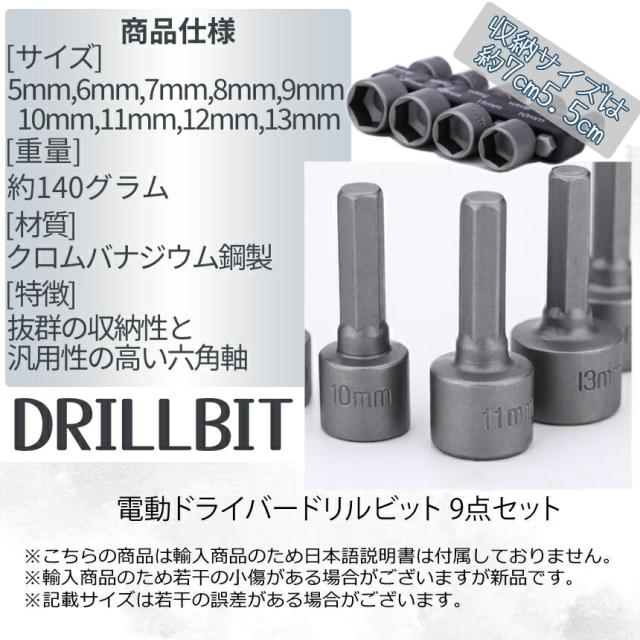 電動 ドライバー ソケット アダプター ビット 9本 セット 5mm〜13mm 六角 シャンク 6.35mm スリーブ 工具 DIY 車 バイク 整備 インパクト ナット ボルト KOGUBIT 送料無料