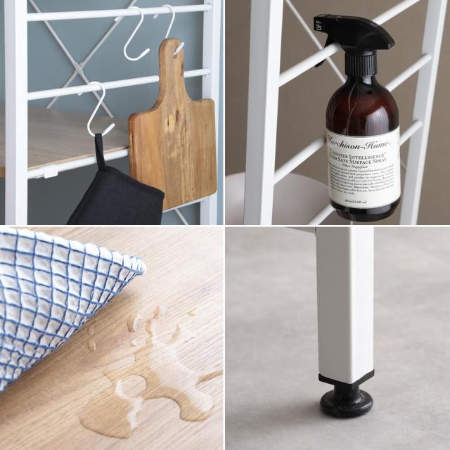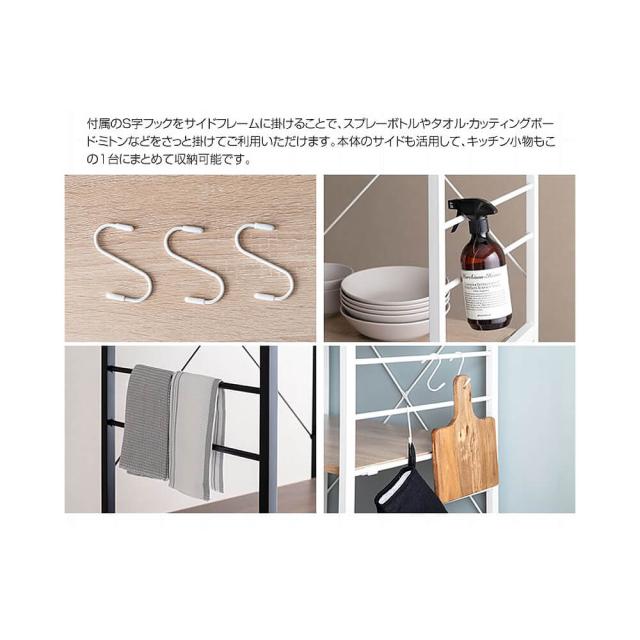 サイドには付属のS字フックを使用することで、スプレーボトルやミトン、タオルなどをサッとかけて収納できます。