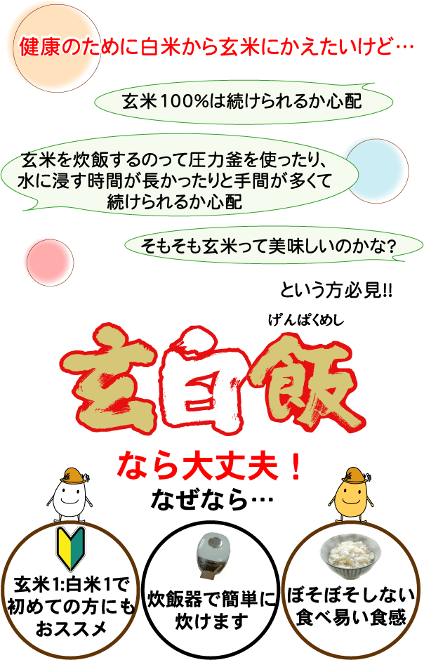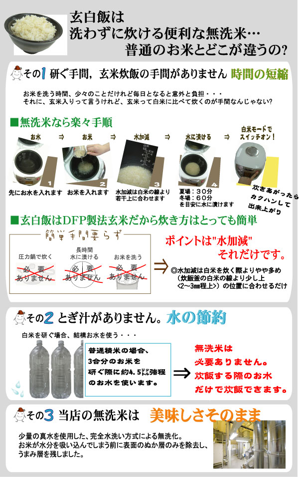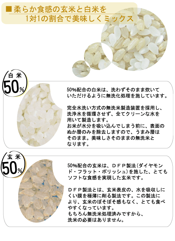 玄米と白米を1対1の割合で美味しくミックス♪玄米にはDFP加工と無洗化処理を施してあるので、無洗米として研ぎ洗いの必要なく炊飯していただけます。