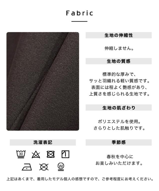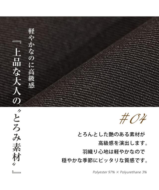 とろんとした艶のある素材が着こなしに高級感をプラスします。羽織り心地は軽やかなので春秋の穏やかな気候にピッタリな質感です!