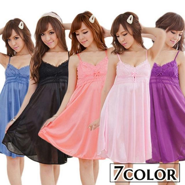 ベビードール スリップ レディース 膝丈 袖なし ネグリジェ キャミソールワンピース ルームウェア サテン調 光沢感 ツヤ感 レ