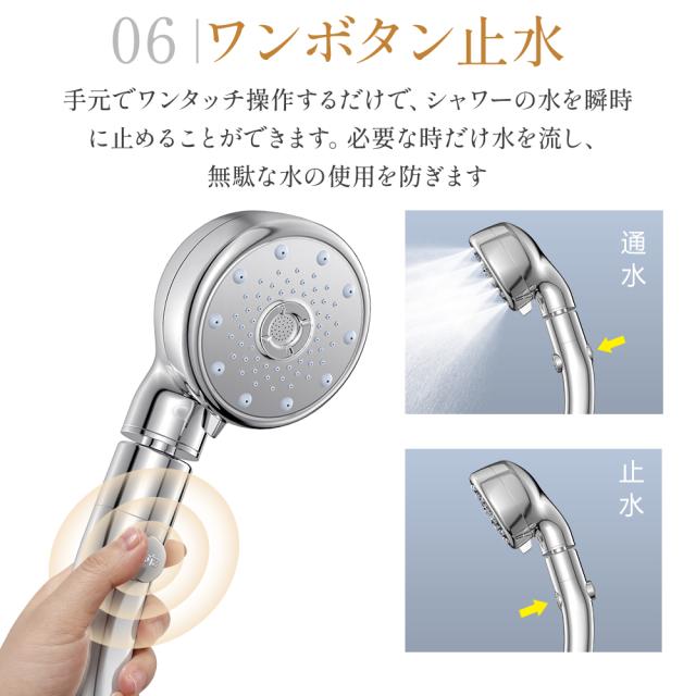 低水圧環境でも強力な水流を提供します。冷水と温水が混水弁に入る前にシャワーヘッドの増圧装置を通ることで、水温と水圧、出水量を安定させ、急な温度変化がなく!独自の精密な散水板により、使用感を損なわずに最大80%の節水が可能。水道代だけでなく、ガス代や電気代も節約でき、環境にもお財布にも優しいです。また、人間工学に基づいたワンタッチ止水ボタンで、水流のオン・オフを簡単に操作できます。