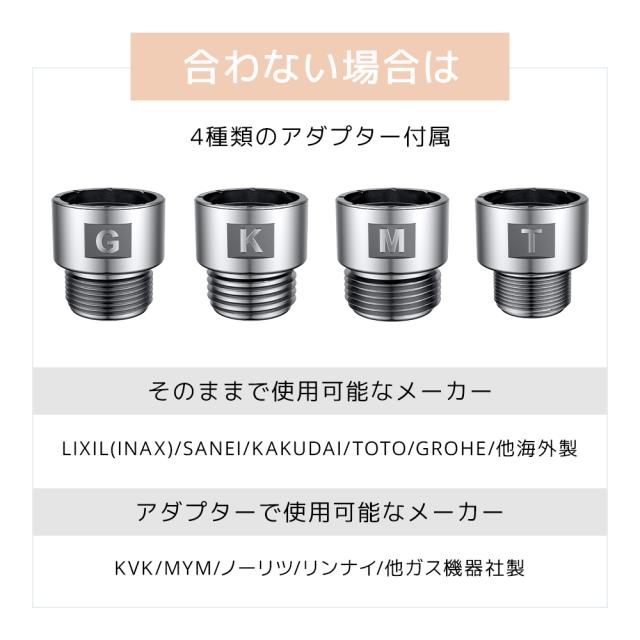 光沢感と高級パッケージで、理想的なギフトとしてもおすすめです。工具不要で簡単に取り付け可能、ひねるだけで瞬時に交換完了。ご自宅のホースに合わなくても安心!K/M/G/Oの4種のアダプターが付属しており、、ほとんどのシャワーホースに対応します。