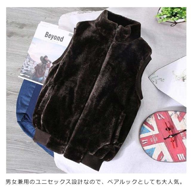 | 思わず頬をよせたくなるフェイクファーベスト。 ふわふわ柔らい素材で、保温性よく、上品でおしゃれ。 コーデにプラスするだけでお洒落な最旬モテスタイルが完成! フロントジップアップタイプで袖口、裾は伸縮性のあるリブに切り替えで、すっきりした印象。 男女兼用のユニセックス設計なので、ペアルックとしても大人気。 | |