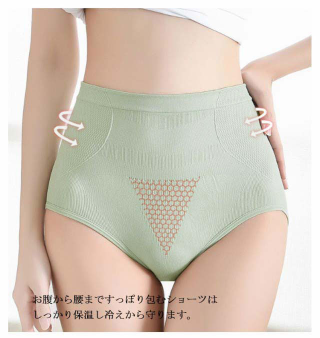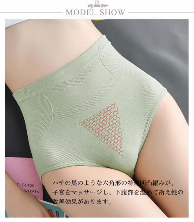| 3D立体構造&ハイウエストデザインのレディースショーツ。 ハチの巣のような六角形の特殊凹凸編みが、子宮をマッサージし、下腹部を温めて冷え性の改善効果があります。 下腹部を引き締めながら、ヒップを引き上げて美しいラインを作ってくれます。 吸汗速乾性を持つ素材で、抜群の伸縮性と程よいフィット感で、ストレスフリーな着心地! クロッチ部分は綿100%で肌触りしなやか、通気性・防臭性にも優れています。 お腹から腰まですっぽり包むショーツはしっかり保温し冷えから守ります。 | |