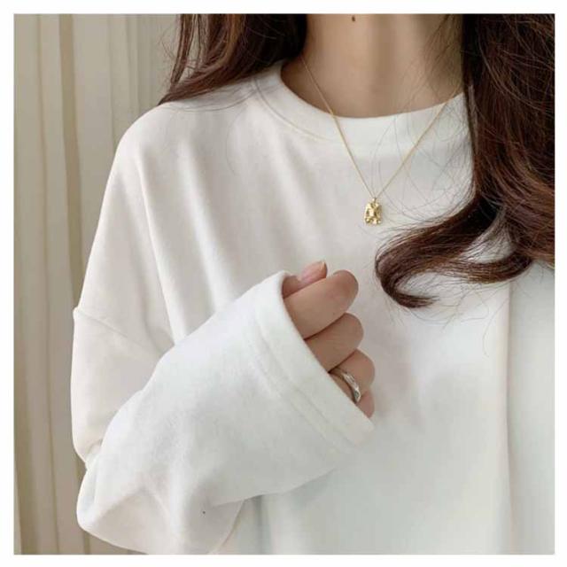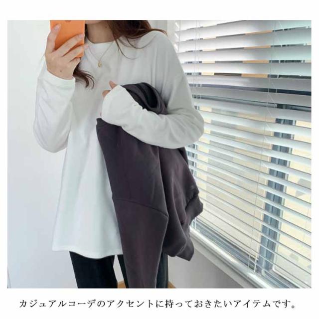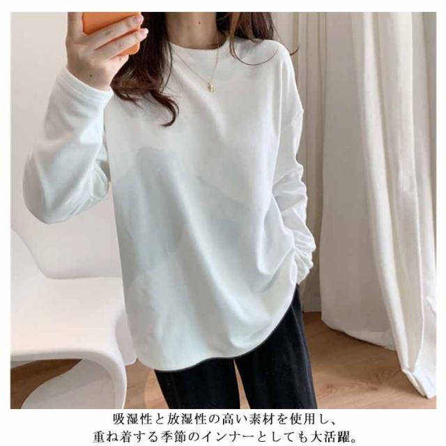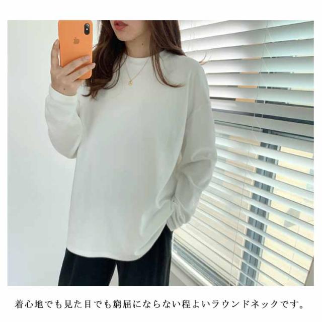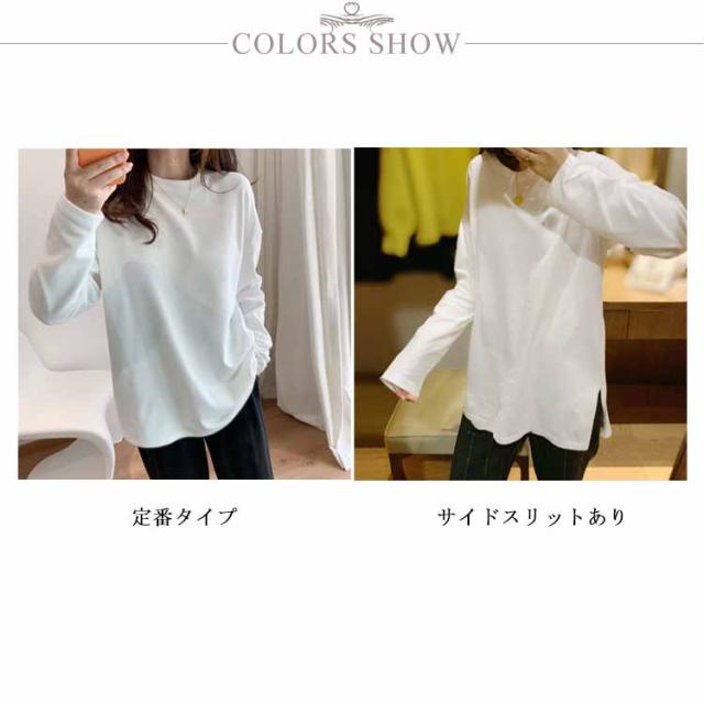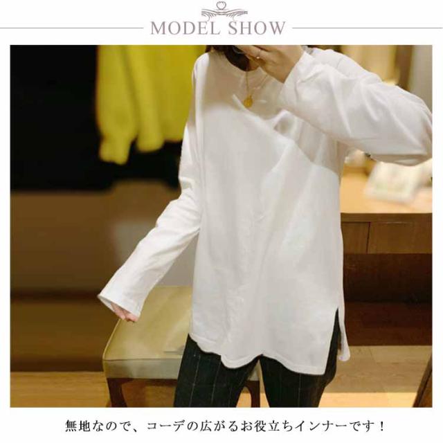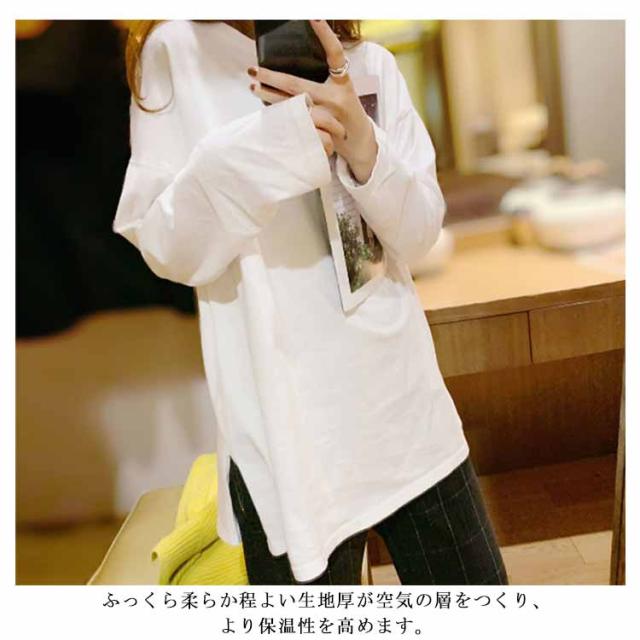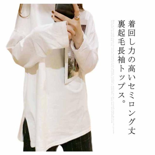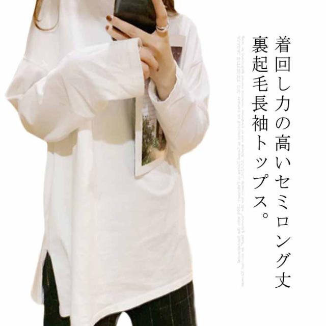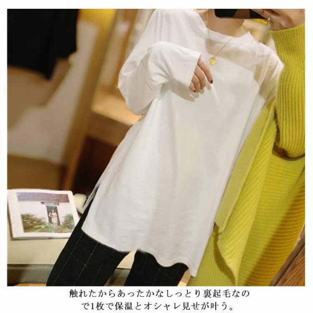 重ね着 インナー 長袖 レディース 裏起毛 柔らかい 保温 あったか レイヤード 裾 トップス カットソー Tシャツ ラウンドネック 厚手 無地 ゆったり セミロング 定番 サイドスリット ホワイト 白 大きいサイズ 秋冬 春 送料無料