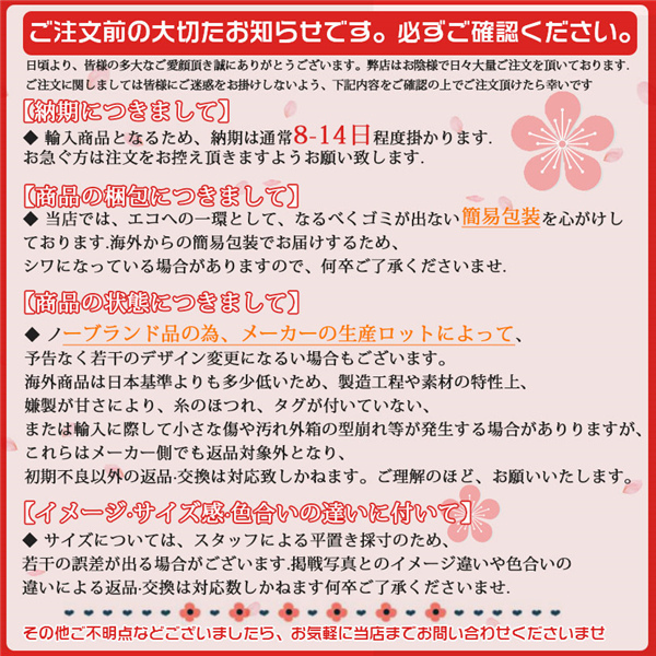 - サイズを注文時間違ってしまい問い合わせたらサイズ変更をスムーズにして頂けました!発送に時間は他店に比べると遅いですが、余裕をもって注文すれば全然問題ないです!とてもいい買い物が出来ました