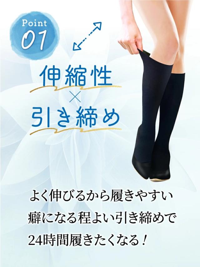 糸からこだわった独自設計の靴下は、伸縮性が高く、履きやすいのにしっかりとした着圧素材。