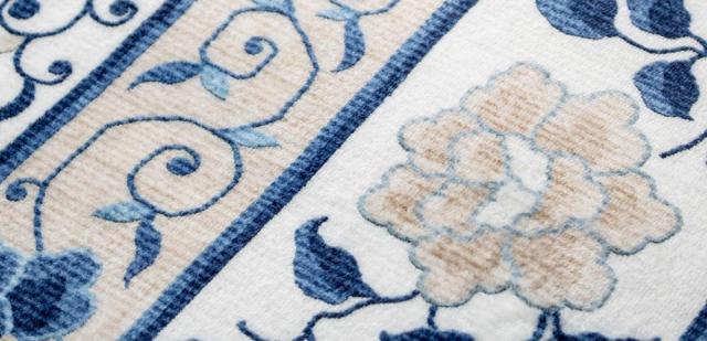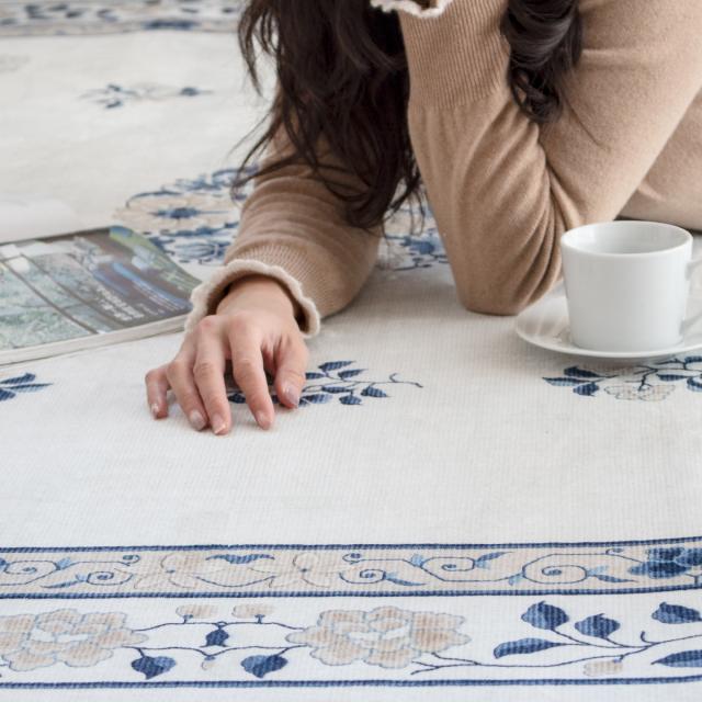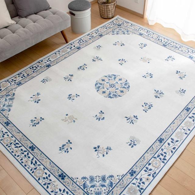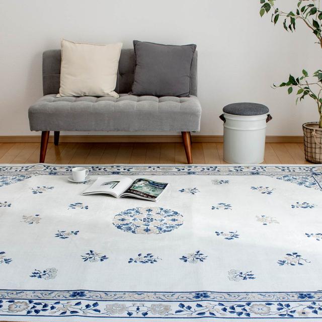 フェミニンな花柄でありながら、どこか東洋を感じさせる転写プリントラグです。シンプルなお部屋はもちろん、韓国インテリアなどシノワズリなインテリアにも合います。