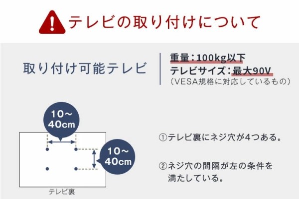 テレビ取付部:約100kg以下(90v型テレビ以下 VESA規格対応)