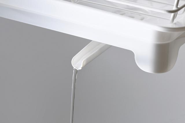 水受け皿には排水ノズルが付いているのでそのままシンクへ排水できます。水切りバスケットの置く位置によって、ノズルの位置が変えられるのでどんなキッチンにも使えます。