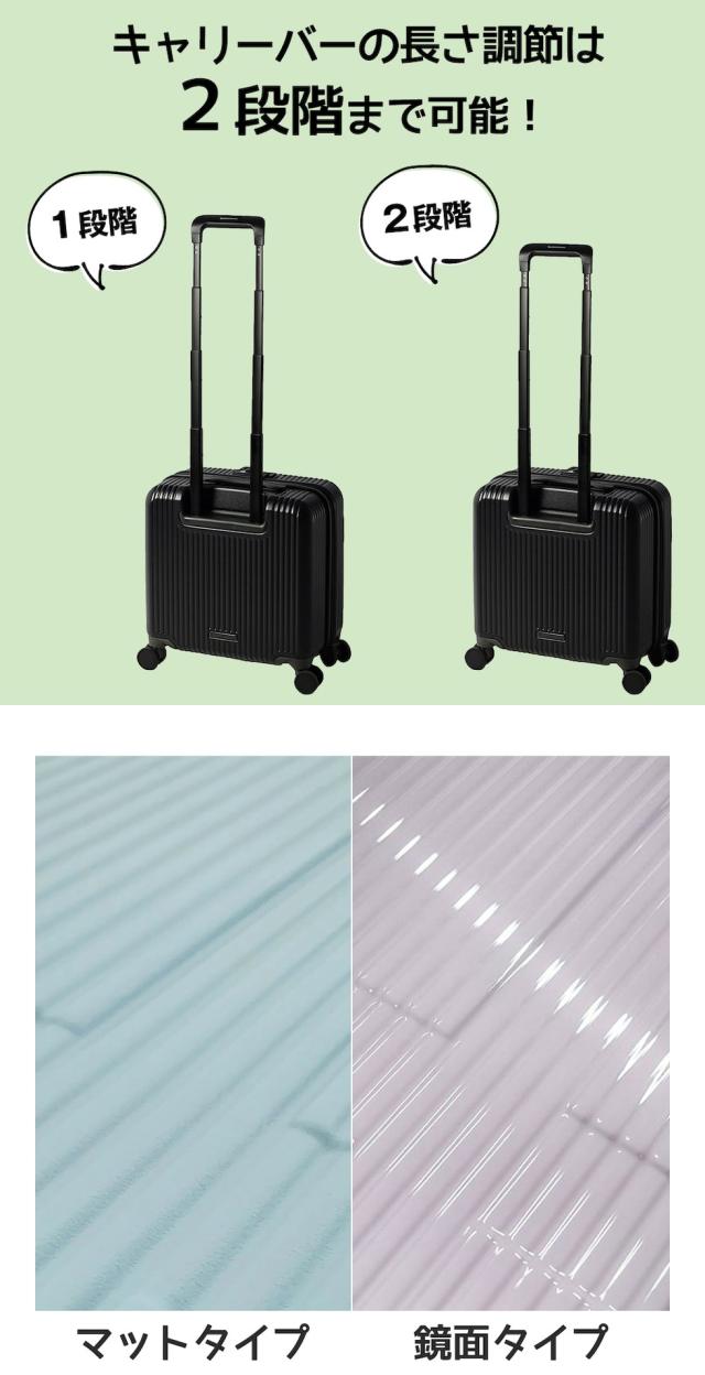 機内持ち込みも可能なサイズです。キャリーバーは2段階調整が可能。