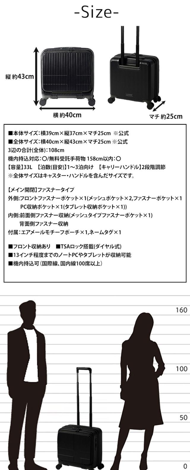 | サイズ(約) ※当店実寸値 | 公式サイズ 本体:横39cm×縦37cm×マチ25cm 全体:横40cm×縦43cm×マチ25cm 3辺の合計(全体):108cm 機内持込対応:〇 無料受託手荷物 158cm以内:〇 【容量】33L 【泊数(目安)】公式|1〜3泊程度、自社|1〜3泊程度 【キャリーハンドル】2段階調節 ※全体サイズはキャスター・ハンドルを含んだサイズです。 | ||