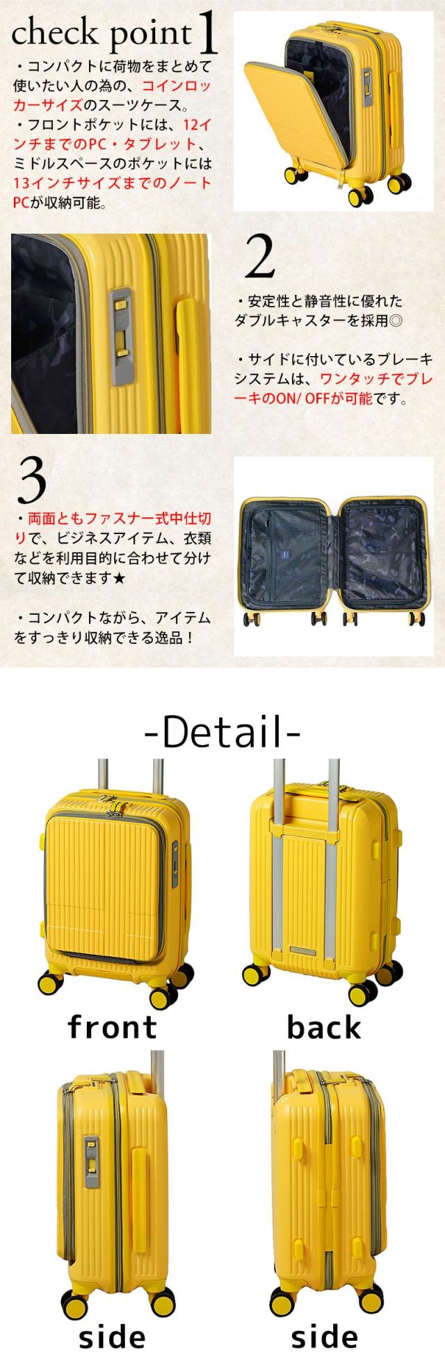| 備考 | 【メイン開閉】ファスナータイプ 外側/ ▼フロントファスナーポケット×1 メッシュポケット×2 ファスナーポケット×1 PC収納ポケット×1(タブレット収納ポケット×1) 内側/ ▼前面側ファスナー収納 メッシュタイプファスナーポケット×1 ▼背面側ファスナー収納 付属/ エアメールモチーフポーチ×1 ネームタグ×1 ■フロントファスナーポケット内から前面側ファスナー収納にアクセス可能なファスナー有 ■13インチ程度までのノートPCやタブレットが収納可能 ■TSAロック搭載(ダイヤル式) ■機内持込可(国際線、国内線100席以上) ■Lisof キャスター(日本メーカー HINOMOTO社製)を採用 ■ワンタッチでブレーキのオン・オフが可能 キーワード: 保証付き EXTREME JOURNEY メンズ レディース 定番 人気 売れ筋 シンプル 男性 女性 ビジネス 出張 旅行 日帰り 温泉 1泊 2泊 軽量 ダイヤルロック キャスターロック 静か 静音 滑らか TSロックポーチ付き パステルカラー ビビットカラー くすみカラー ネイビー 水色 白色 緑色 薄緑 灰色 黒色 黄色 紺色 薄紫 オフホワイト ペイルブルー ペイルグリーン ペイルオレンジ Sサイズ コンパクト PC収納 11インチ 13inch フロント収納 フロントポケット 学生 ブランド ポイント消化 ニューバッグワカマツ ニューバックワカマツ | ||