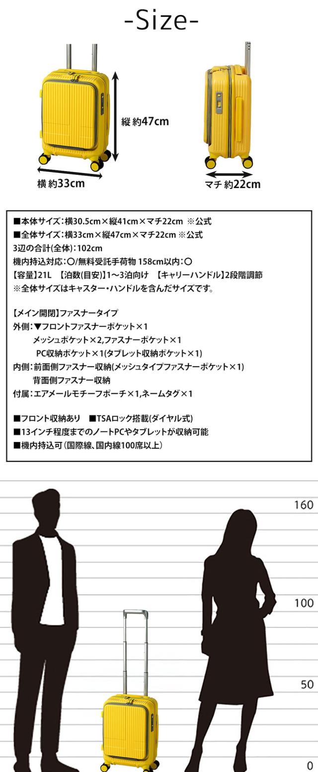 | サイズ(約) ※当店実寸値 | 公式サイズ 本体:横30.5cm×縦41cm×マチ22cm 全体:横33cm×縦47cm×マチ22cm 3辺の合計(全体):102cm 機内持込対応:〇 無料受託手荷物 158cm以内:〇 【容量】21L 【泊数(目安)】公式|1〜3泊程度、自社|1〜3泊程度 【キャリーハンドル】2段階調節 ※全体サイズはキャスター・ハンドルを含んだサイズです。 | ||