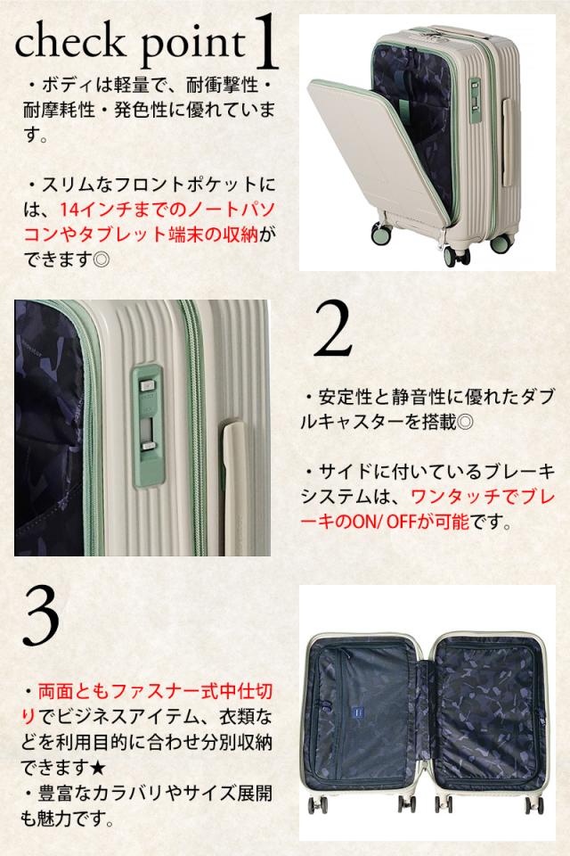 | 備考 | 【メイン開閉】ファスナータイプ 外側/ ▼フロントファスナーポケット×1 ・メッシュポケット×2 ・ファスナーポケット×1 ・PC収納ポケット×1(タブレット収納ポケット×1) 内側/ ▼前面側ファスナー収納 ・メッシュタイプファスナーポケット×1 ▼背面側ファスナー収納 ・バックルクロスベルト×1 付属/ エアメールモチーフポーチ×1 ネームタグ×1 ■フロントファスナーポケット内から前面側ファスナー収納にアクセス可能なファスナー有 ■14インチ程度までのノートPCやタブレットが収納可能 ■TSAロック搭載(ダイヤル式) ■機内持込可(国際線、国内線100席以上) ■Lisof キャスター(日本メーカー HINOMOTO社製)を採用 ■ワンタッチでブレーキのオン・オフが可能 キーワード: 保証付き EXTREME JOURNEY メンズ レディース 定番 人気 売れ筋 シンプル 男性 女性 ビジネス 出張 旅行 温泉 1泊 2泊 軽量 ダイヤルロック キャスターロック 静か 静音 滑らか TSロック ポーチ付き マットキャリー 鏡面キャリー パステルカラー ビビットカラー くすみカラー ネイビー 水色 白色 緑色 薄緑 灰色 黒色 黄色 紺色 薄紫 オフホワイト ペイルブルー ペイルグリーン ペイルオレンジ Sサイズ コンパクト PC収納 14inch フロント収納 フロントポケット 学生 ブランド ニューバッグワカマツ ニューバックワカマツ | ||
