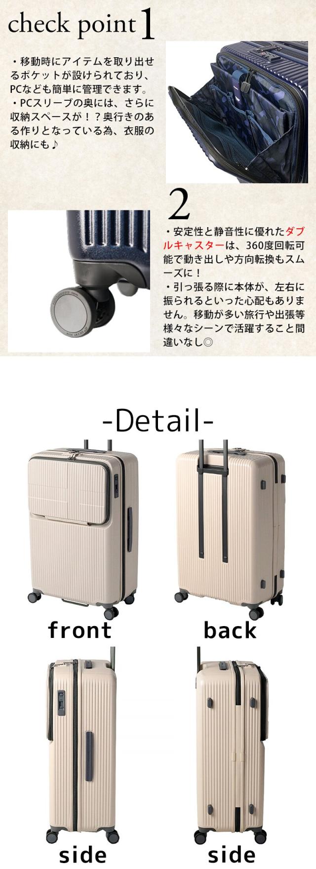| 備考 | 【メイン開閉】ファスナータイプ 外側/ ▼フロントファスナーポケット×1 ・メッシュファスナーポケット×1 ・PC収納ポケット×1 ・ポケット×3 ・隠しファスナーポケット×1 内側/ ---------- 【旧型】 ▼右側/ファスナー収納×1 ・バックルクロスベルト×1 ▼左側/メッシュタイプファスナー収納×2 ---------- 【新型】 ▼右側/ファスナー収納×1 ・バックルクロスベルト×1 ▼左側/ファスナー収納×1 ・メッシュタイプファスナーポケット×1 ・バックルクロスベルト×1 ---------- 付属/ エアメールモチーフポーチ×1 ネームタグ×1 コースター×1 ■トップオープンポケット ■TSAロック搭載 ■ワンタッチブレーキ ■消音ダブルキャスター ■ボトムハンドル ■ソフトフィットハンドル ■新型のみ/フロントポケット内にメインルームに繋がるファスナー搭載 キーワード: 保証付き EXTREME JOURNEY メンズ レディース シンプル 男性 女性 ビジネス 出張 旅行 定番 人気 売れ筋 軽量 新色 パステルカラー ビビットカラー くすみカラー ネイビー 水色 白色 緑色 薄緑 灰色 黒色 黄色 紺色 学生 5泊 6泊 長期 TSロック 留学 アメリカ ハワイ グアム USA 4輪 双輪 静音 フロントポケット PC収納 タブレット収納 ブランド ペイルブルー ペイルグリーン ヴァニラ ポイント消化 ニューバッグワカマツ ニューバックワカマツ | ||