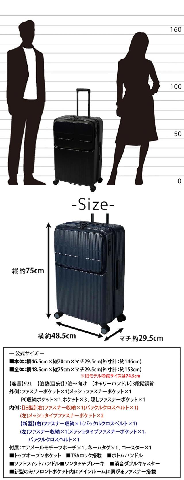 | サイズ(約) ※当店実寸値 | 公式サイズ 本体:横46.5cm×縦70cm×マチ29.5cm 全体:横48.5cm×縦75cm×マチ29.5cm 3辺の合計(全体):153cm 機内持込対応:× 無料受託手荷物 158cm以内:〇 【容量】92L 【泊数(目安)】公式|7泊以上、自社|7泊以上 【キャリーハンドル】3段階調節 ※全体サイズはキャスター・ハンドルを含んだサイズです。 ※旧モデルの縦サイズは74.5cmになります。 | ||