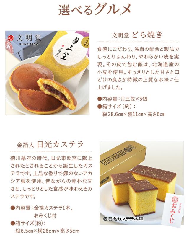 選べるグルメの種類:文明堂どら焼き、日光カステラ、中島大祥堂 こがね芋、中島大祥堂 吉野の葛餅、中島大祥堂 キュートセレクション、中島大祥堂 ピッコロドルチェ