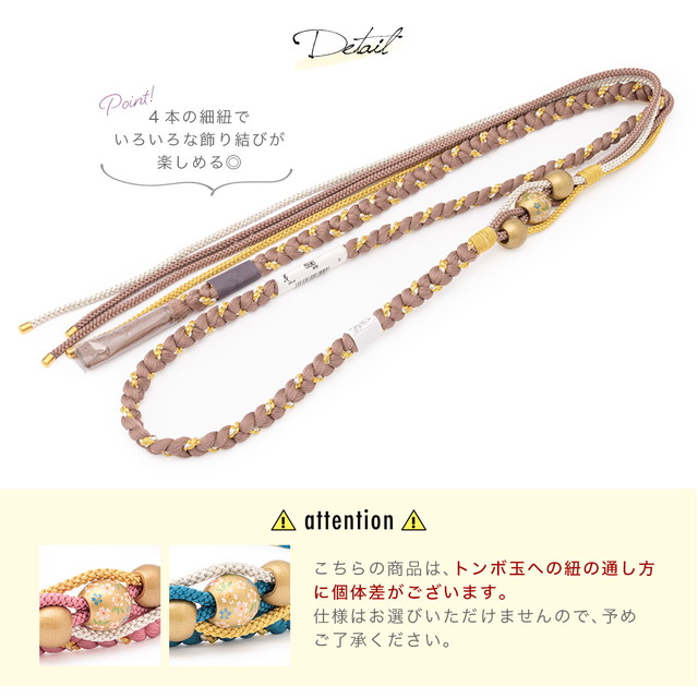 片方は細めの組み紐が四本に別れ、変わり結びが楽しめます。