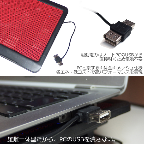 雄雌USBによる電源のため、ノートPC備え付けのUSBを殺しません。