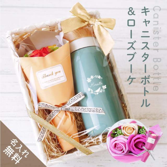 敬老の日 プレゼント 水筒 400ml 名前入りギフト マグ 直飲み キャニスターボトル&ローズブーケ 翌々営業日出荷 セット 保温保冷 真空断熱 ステンレス かわいい おしゃれ 枯れない 花 花束 ブーケ ピンク ブルー 女性 母 母親 義母 お母さん