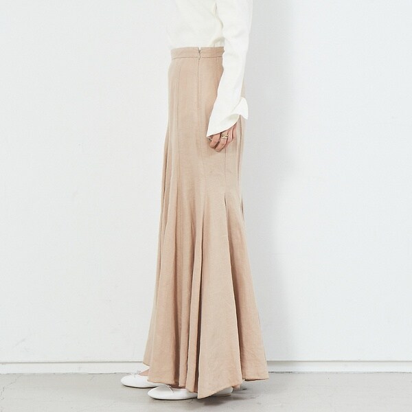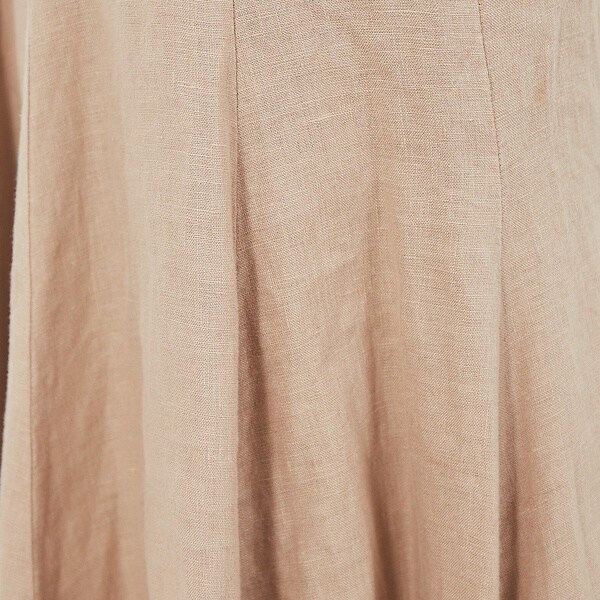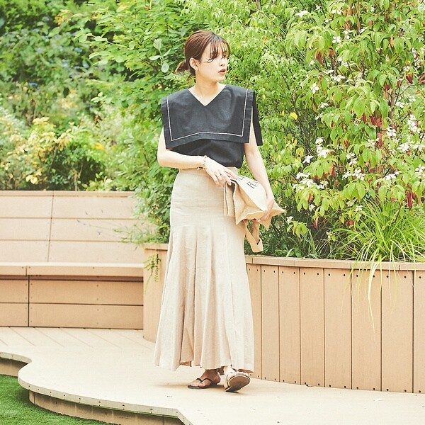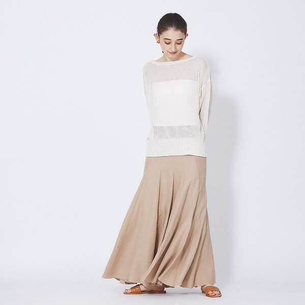 定番のフランダースリネン素材のナチュラルな風合いと、分量感のあるフレアシルエットで高見えを叶えてくれます。