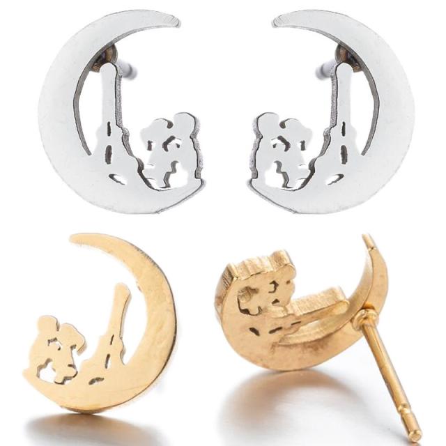 三日月ムーンとエッフェル塔のタワーをバックにカップルがキスをするラブシーンのようなステンレス素材のスタッドピアス。