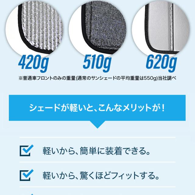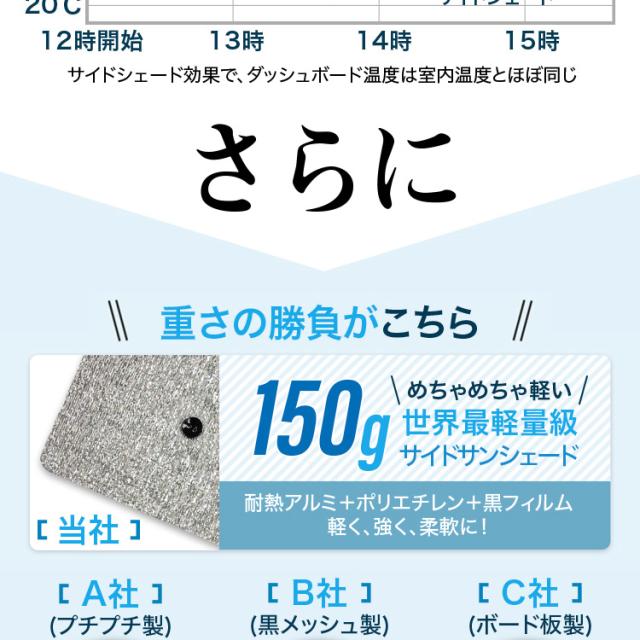 - 運転席助手席の太陽光がいつも気になっていたのですが、この商品は軽くて窓にもピッタリ丁度良い大きさでハマりました。明日からまた暑くなるので、車内の温度が少しでも抑えられたら良いと思いました。購入して良か...