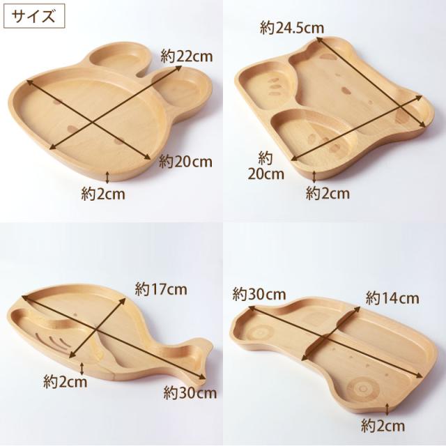 プレート:(うさぎ)20×22×2cm (くま)24.5×20×2cm (くじら)30×17×2cm (くるま)30×14×2cm スプーン、フォーク:長さ12×幅2.5cm |